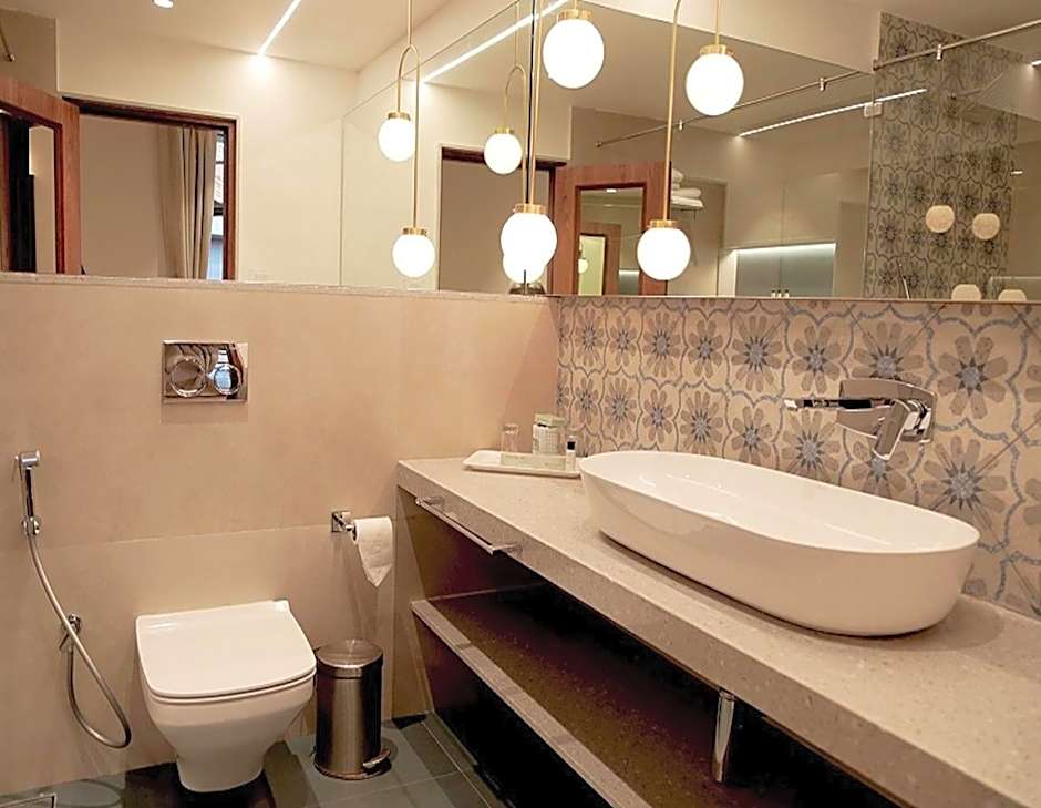 The 450 sq ft Cottage Apartment Premium consists of a sizable living room equipped with a sofa-cum bed and writing desk, a cozy bedroom having a king bed and a scenic patio overlooking the sprawling lawn. The room is infused with warm touches of wood and Portuguese hand-painted tiles, while having both ambient and mood lighting. The bathroom is spacious and elegant with its combination of stone and marble and is fitted with stylish fixtures.