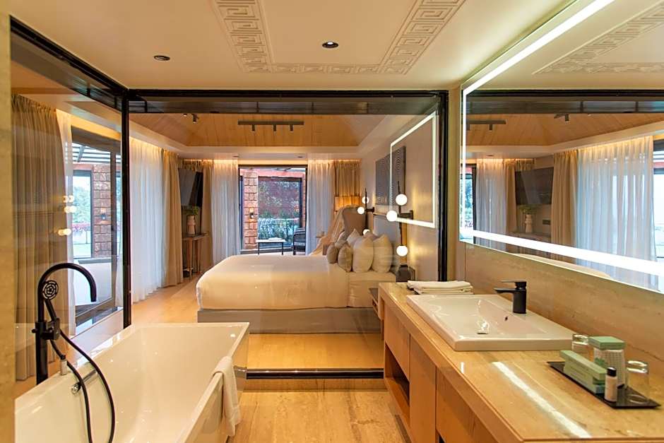 The rooms consist of a spacious bedroom with a writing desk, along with an adjoining lounge area that has a sofa-cum-bed and opens to a patio with an internal resort view. It is designed with a contemporary modern aesthetic, with a focus on blending the outside with the inside. Inspired by the scenic hills and valleys of Mahabaleshwar, the materials used are tactile and natural – earth tones, natural cane, custom crafted panels from Indian villages, and organic hand block printed upholstery. The luxurious and spacious bathroom, clad in Italian marble and furnished with state-of-the-art fittings, is striking and yet soothing.